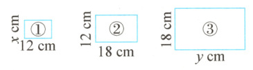 把②号长方形按比例缩小和放大后得到了①号和③号两个长方形,请分别写出两个比例,并求出未知数$x$和$y$。