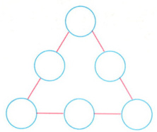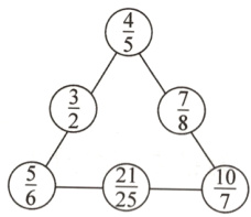 把$\frac{21}{25}、\frac{3}{2}、\frac{10}{7}、\frac{7}{8}、\frac{5}{6}、\frac{4}{5}$这六个数填入右边的〇里,使三角形每条边上3个数的乘积都是1。
