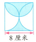 $8×8 - 3.14×(8÷2)^2 = 13.76$(平方米) $8×8 - 13.76×2 = 36.48$(平方米) 解析 由图可知,四块空白部分的面积相等,可以将图中左右两个半圆拼成一个整圆,用正方形的面积减去这个整圆的面积,就是上、下两个空白部分的面积和,再用正方形的面积减去上、下两个空白部分面积和的2倍,就可以求出花坛的面积。