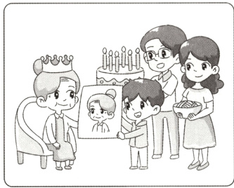 今天是奶奶的生日,小明和爸爸妈妈一大早就前往奶奶家了。爸爸去蛋糕店挑选了一个美味的大蛋糕,妈妈给奶奶准备了长寿面。到了奶奶家,小明拿出了给奶奶准备的生日礼物,是一幅小明自己画的奶奶的肖像画,小明还祝奶奶寿比南山。奶奶夸小明既聪明又孝顺,爸爸和妈妈也都笑了,一家人其乐融融。