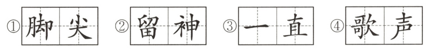 ④ [解析]本题考查生字词的正确书写。其中“脚尖”一词中,“尖”字上面的“小”应该去掉钩;“留神”一词中,“神”字的偏旁应该是“礻”;“一直”一词中,“直”字里面应该是三道横。故选④。