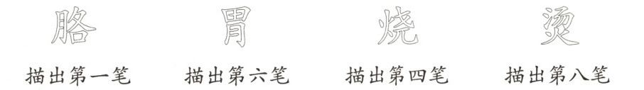 [解析]1. 本题考查汉字书写。“胳”的第一笔是:撇。“胃”的第六笔是:竖。“烧”的第四笔是:点。“烫”的第八笔是:撇。2. 本题考查字的偏旁和字义的关系。含有“月”这个偏旁的汉字,大致有这样两类:少数是真正与月亮相关的,比如朗、朦、胧、朔等;绝大多数是与身体部位相关的,比如肱、股、胸、腹、背等。由“火”字演变的偏旁有:火、灬。