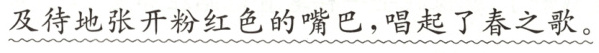 ____嫩绿____的小草从地里钻出头:“哇!春天来了!”它赞叹着,也加入了这场盛大的音乐会。