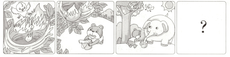 小鸟的家着火时,谁来帮忙了?他们是怎样做的?想象一下,结果怎么样?仔细看图,把你看到的和想到的用几句话写出来。(不会写的字可以用拼音代替)