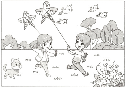 春天到了,万物复苏,鲜花盛开,风儿轻轻地吹,好像在说:“小朋友们快出来玩儿吧!”丽丽和小明听到了风儿的呼唤,都拿着风筝出来玩儿。小明拉扯着风筝线向前奔跑,风儿将风筝送上了蓝天。小明兴奋地喊道:“我的风筝飞起来啦!我的风筝飞起来啦!”丽丽不甘落后,也跑起来。瞧,她的风筝也飞起来啦!天空中,飞翔的小鸟叽叽喳喳地叫着,好像在说:“好漂亮的风筝啊!”在草地上奔跑的小狗“汪汪”地叫着,好像在说:“我也想放风筝!”