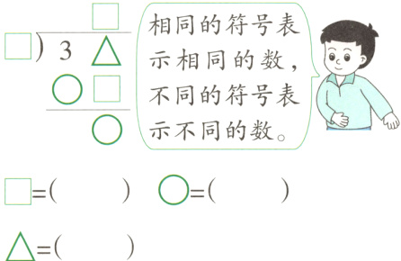 6 3 9 解析:观察这个有余数的除法竖式可知,除数和商是相同的数,除数和商相乘的积是三十几,所以〇=3。又知积的个位数与除数和商也相等。根据口诀“六六三十六”求出商和除数都是6,根据余数为3,求出被除数应该是36+3=39。
