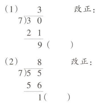 解析:题中的余数是9大于7,还能继续除,所以商小了,应该加1,也就是4,即30÷7=4……2。