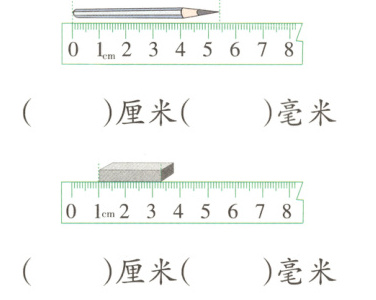 5 4 2 3 解析:题中第1个图左端对准0刻度,右端在5厘米和6厘米之间,超过5厘米4个小格,是5厘米4毫米。第2个图左端对准1,右端在3厘米和4厘米之间,超过3厘米3个小格,是3厘米3毫米,应用右端刻度减去左端刻度,3厘米3毫米 - 1厘米=2厘米3毫米。