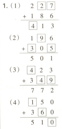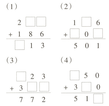 (1)小题,先填个位,想几加6都不可能得3,得出7+6=13,向十位进1,加数的个位上是7;再填十位,想几加1再加8得个位上是1的数,得出11 - 8 - 1=2,在加数的十位上写2;最后填百位,十位向百位上进了1,所以得出2+1+1=4,在和的百位上写4。其他依此类推。