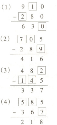 (1)小题,先填个位,个位上0 - 0=0,所以差的个位上是0;再填十位,十位上3+8=11,所以被减数的十位上是1;最后填百位,由前面可知百位借给了十位1,所以减数的百位上是9 - 1 - 6=2。其他依此类推。