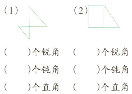 (2)2 1 5 解析:数较复杂图形中的锐角、钝角和直角时,要有次序,不重复、不遗漏地数出图形中的角,再判断出各类角的个数。
