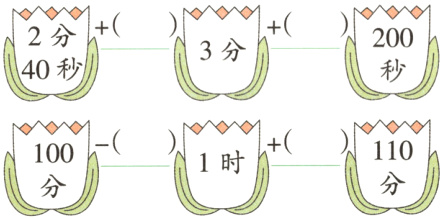 解析:当计算题中同时出现分和秒或时与分时,先统一单位再进行计算。2分40秒+( ) = 3分,可以转化为40秒+( ) = 1分,得出2分40秒 + 20秒 = 3分。3分 = 180秒,3分 + 20秒 = 200秒。同理做第二题。
