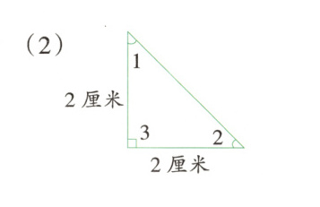 解析:题中三角形的两边都是2厘米,则相等,且有一个角是直角,是一个等腰直角三角形,则∠1=∠2=45°,∠3=90°。