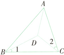 解析:线段BD、AD、CD分别把∠ABC、∠BAC、∠ACB平均分成2份,因此∠ABC是∠1的2倍,∠ACB是∠2的2倍,据此可求出∠BAC的度数,再除以2就是∠DAC的度数。