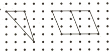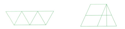 解析:第一个图形中,三角形有5个;两个小三角形拼成的平行四边形有4个,4个小三角形拼成的平行四边形有2个,一共有4 + 2 = 6(个)平行四边形;由3个小三角形拼成的梯形有3个,由5个小三角形拼成的梯形有1个,一共有3 + 1 = 4(个)梯形。第二个图形中,三角形有6个;单个的平行四边形有2个,由2个平行四边形拼成的平行四边形有1个,一共有2 + 1 = 3(个)平行四边形;单个的梯形有2个,由2个图形拼成的梯形有3个,由3个图形拼成的梯形有2个,由4个图形拼成的梯形有1个,由6个图形拼成的梯形有1个,一共有2 + 3 + 2 + 1 + 1 = 9(个)梯形。