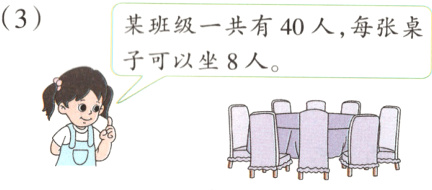 (3)8人×桌子数=40人解析:根据情境可以知道每张桌子可以坐8人,所以得出“一张桌子坐的人数×桌子数=总共的人数”即“8人×桌子数=40人”。