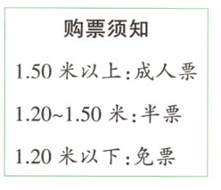 1.18米 < 1.20米,因此小红免票;1.20米 < 1.37米 < 1.50米,因此小英半票;1.52米 > 1.50米,小亮购买成人票。