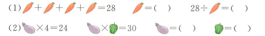 (1)①由 + + + =28可知,此题是将28平均分成4份,求每份是多少,用除法计算,28÷4=7,则 =7;②把 =7代入28÷