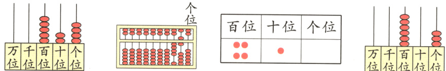 (1)算盘上一颗上珠表示5,一颗下珠表示1,拨2颗算珠,最大的三位数是600,最小的三位数是101。