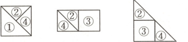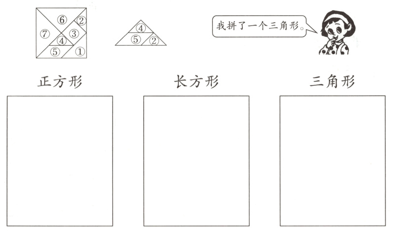 3. 下图是一副七巧板,贝贝用其中的三块拼了一个三角形。请你也每次选三块,拼出下面的图形。(9分)