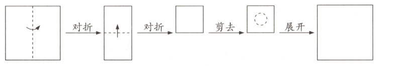 如下图,小明将一张正方形纸先左右对折,再上下对折,然后在中间抠去一个圆。请你将展开图画出来。