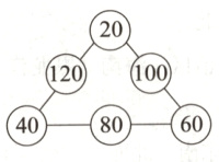 在○里填上20,40,60,80,100,120,使每条线上三个数的和都等于180。