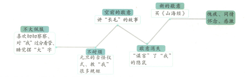 ◎【梳理情感变化】速读课文,用“。”标出直接表达“我”对阿长情感态度的词语,并结合相关事件画出情感变化示意图。