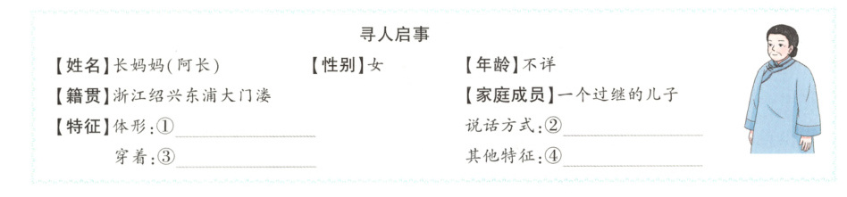 鲁迅成年后,想找到已失去联系多年的保姆阿长,请你结合课文内容替他完成这则“寻人启事”。