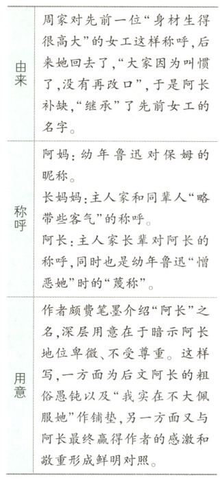 我那隐鼠的却是她的时候,就叫她阿长。(批注 大词小用 “憎恶”“谋死”大词小用,夸张地表现了儿童的心理,表达了“我”对阿长“谋死”隐鼠的不满和愤怒。)2 我们那里没有姓长的;她生得黄胖而矮,“长”也不是形容词。(批注 “黄胖而矮”准确地刻画了阿长的体态特征,与“长”字形成鲜明对比,产生了一种幽默诙谐的意味。)又不是她的名字,记得她自己说过,她的名字是叫作什么姑娘的。什么姑娘,我现在已经忘却了,总之不是长姑娘;也终于不知道她姓什么。记得她也曾告诉过我这个名称的来历:先前的先前,我家有一个女工,身材生得很高大,这就是真阿长。后来她回去了,我那什么姑娘才来补她的缺,然而大家因为叫惯了,没有再改口,于是她从此也就成为长妈妈了。 连姓名都不为人所知,说明了阿长身份卑微。