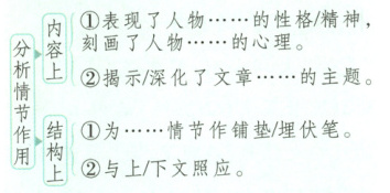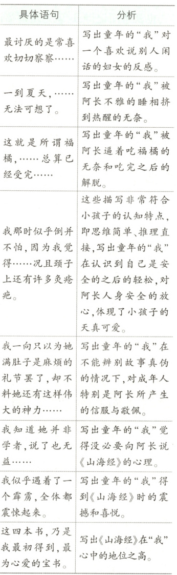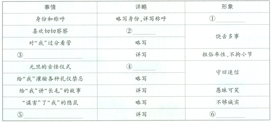 [参考答案] ①身份低微 ②略写 ③睡觉摆成“大”字 ④详写 ⑤给“我”买《山海经》 ⑥热心善良、仁厚慈爱