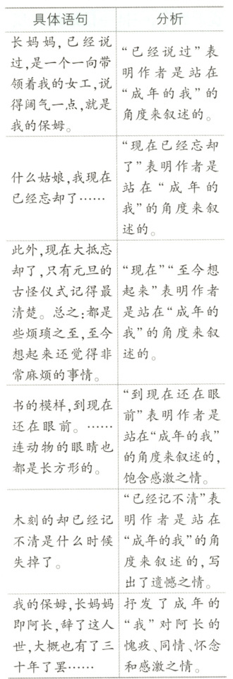 ◎【品味视角之妙】在这篇回忆性散文中,作者将写作时的回忆与童年的感受彼此交错转换。请找出相关的一些语句并体会两种叙述视角的不同。(P128“思考·探究·积累二”第1题)(学习目标二)