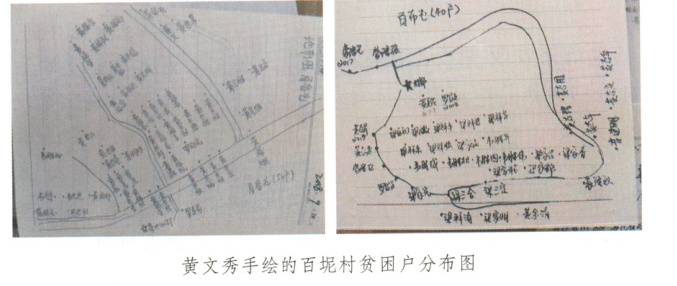 13 百布屯、百爱屯、长沙屯……每走访一户,她就在本子上做一个标记——村部用五星标识,圆点代表人家,短线代表山路或河流。两个月的时间,黄文秀用双脚丈量了百坭村的沟沟坎坎,逐一走访了村里的贫困户。小小一个点,短短一条线,浓缩了百坭村的山水风土、村情民意,汇成了一份贫困户分布图。有了它,黄文秀心里有底了。