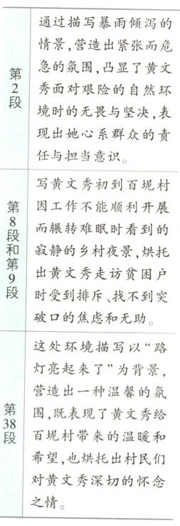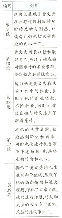表现了黄文秀所代表的精神在广大扶贫干部中的普遍性,同时将对黄文秀的敬仰和怀念之情,扩展到对全国扶贫干部的集体敬意和感激,既升华了情感,也深化了文章的主题;②该段在总结扶贫工作的同时,也表达了对未来乡村振兴的美好展望。