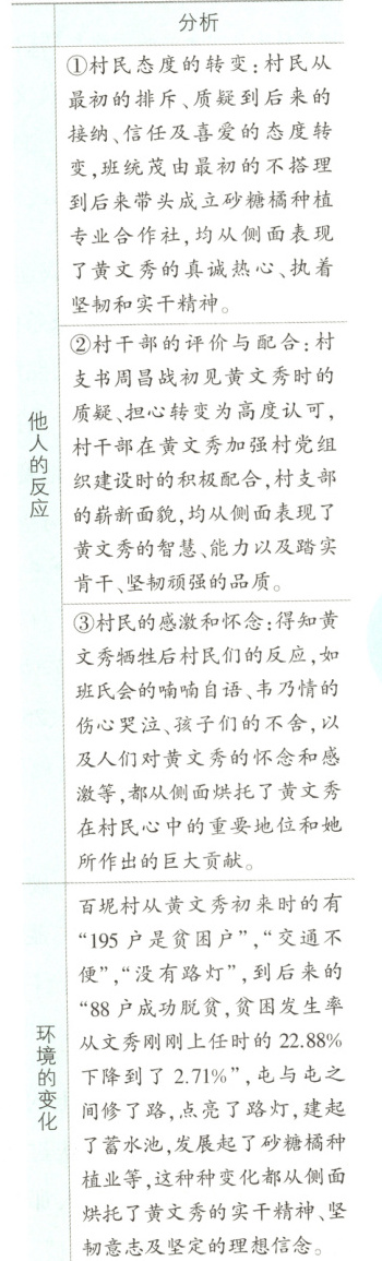 @【分析侧面描写】在塑造黄文秀的形象时,作者巧妙地运用了侧面描写的手法,从他人的反应、环境的变化等方面烘托出了黄文秀的优秀品质和崇高精神。请你任选一个方面,结合文章内容进行简要分析。(学习目标三)
