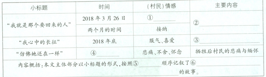 [参考答案] ①质疑、排斥 ②初到百坭村的困境与坚持 ③带领村民脱贫致富的艰辛历程 ④2019年6月18日中午 ⑤时间 ⑥黄文秀带领百坭村村民脱贫,在脱贫攻坚战中取得卓越成就,并和村民建立深厚感情,最终因公牺牲