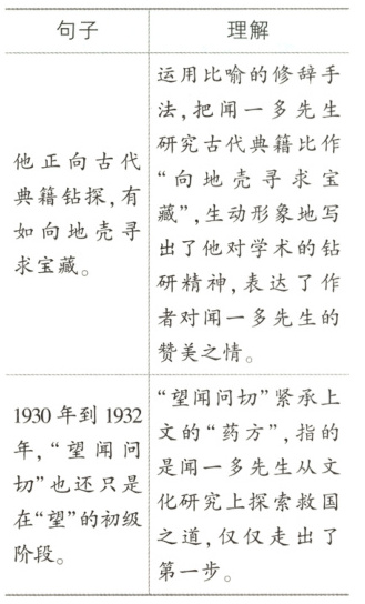 3 作为学者和诗人的闻一多先生,在30年代国立青岛大学的两年时间,我对他是有着深刻印象的。那时候,他已经诗兴不作而研究志趣正浓。【他正向古代典籍钻探,有如向地壳寻求宝藏。】【仰之弥高,越高,攀得越起劲;钻之弥坚,越坚,钻得越锲而不舍①。】他想吃尽、消化尽我们中华民族几千年来的文化史,炯炯目光,一直远射到有史以前。(批注“吃尽”“消化尽”“远射”表现了闻一多研究的决心,表现了他潜心研究、执着追求的精神。)他要给我们衰微的民族开一剂救济的文化药方。(批注 比喻 修辞手法 运用比喻的修辞手法,把闻一多先生要从文化史中寻找使中华民族繁荣昌盛的方法比作“开一剂救济的文化药方”,形象生动地写出了闻一多先生研究学问的目的是力图从文化上寻找振兴民族的途径,表现了他的爱国主义精神。)