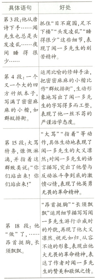 【分析细节描写】作者运用了不少细节描写来展现闻一多的人物形象,试用“____”在文中画出几处并分析其好处。(P27“思考·探究·积累二”)(学习目标二)