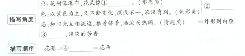 【内容概括】作者是如何描摹紫藤萝花的?表现了紫藤萝花的哪些美?(学习目标一)