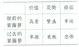 小结:作者由整体到局部,展现了紫藤萝花的形态美、色彩美。先从整体着墨,展示紫藤萝花树的整体形态;再进行局部特写,惟妙惟肖地描摹了一朵朵花的形状。而对于紫藤萝花的颜色,则是浓墨重彩地呈现,以紫为主色调,但又不断变化,既注意了整体色调,又对局部的每一穗花、每一朵花处处关照,让各层次的色彩相互映衬。从上到下,从整体到局部,层次分明。此外,作者笔下的紫藤萝花像天真烂漫、活泼可爱的儿童,充满童趣与旺盛的生命力,从外形到内蕴,展现了其情趣美。