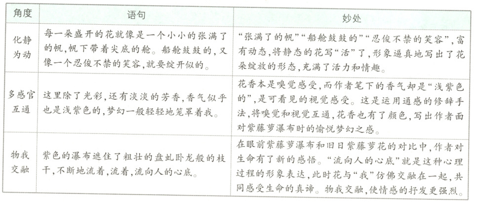 一树紫藤萝花比作“一条瀑布”,生动形象地表现了花的繁盛,隐含生命绵延长远之意,也照应了标题。】只是深深浅浅的紫,仿佛在流动在欢笑,在不停地生长。(注“流动”“欢笑”“生长”等动词,化静为