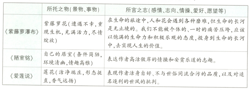 作者借紫藤萝暗示自己的情思,使紫藤萝有了某种寓意。联系上个单元学习的《陋室铭》《爱莲说》,说说你对这种写法的理解。