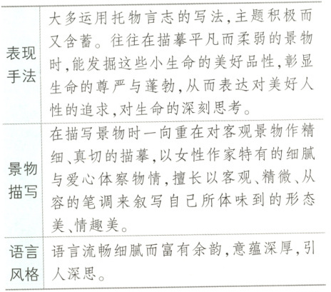 四、宗璞有不少写景状物的散文,如《丁香结》《燕园树寻》《好一朵木槿花》等,课外找来读一读并进行比较,看看这些作品有什么共同的特点。