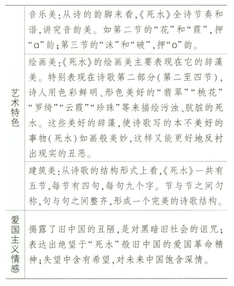 四、课外阅读闻一多的《太阳吟》《死水》《静夜》等诗作,欣赏其艺术特色,感受其中的爱国主义情感。