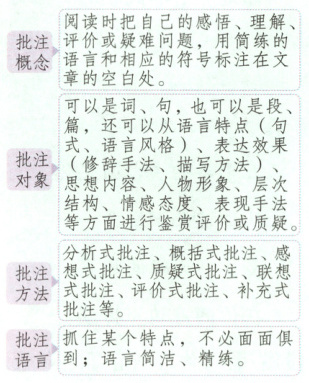 [参考答案] 课文中的“批注示例”第一处是对段落作用的批注,第二处是对字词作用的批注,第三处是在提示诗歌的内容层次,第四处是在赏析句子的表达效果,第五处是对结尾特点的评价。