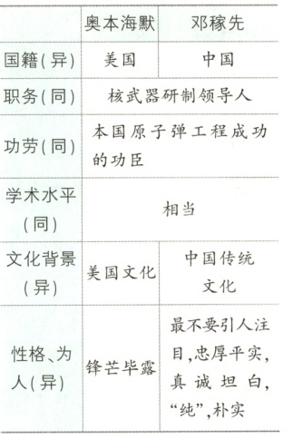 ◎【分析对比】对比奥本海默和邓稼先的异同,说说作者为什么要将两人进行对比,通过对比得出了怎样的结论。(P16“思考·探究·积累一”第2题)同类对比彰显人物