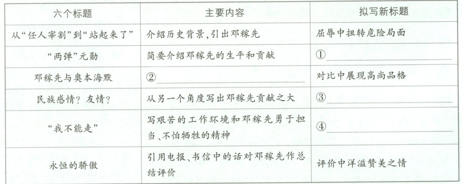 [参考答案] ①危机中研发原子武器 ②以同奥本海默对比的方式突出邓稼先的品格和奉献精神 ③追想中成就民族骄傲 ④艰苦中显示无私无畏