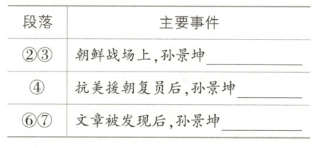 1. ②③:奋战在最前线,九死一生。④:带领村民植树造林,造福乡里。⑥⑦:隐藏功名,初心不改。 2. 体现出战斗持续时间之长,突出孙景坤和战友们坚守之难、战绩之大。 3. 画线句运用了语言描写和神态描写。语言描写表现出孙景坤对“英雄”的理解,体现了他从不居功自傲的谦逊品格。“脸色凝重,眼里含泪”等神态描写表现出他对副连长支全胜等战友的深厚革命友情和敬重之情。 4. 内容上,点明文章主题,画龙点睛;结构上,首尾呼应,总结全文,深化主旨。 5. 在战争年代,孙景坤战功赫赫,是个骁勇善战、热爱祖国的英雄;在和平时期,他深藏功名,回乡建设,造福一方,是个淡泊名利、热爱人民的楷模。 6. 【示例】孙爷爷,您是我心中的英雄!您当年参加解放战争、抗美援朝战争,冲锋陷阵,九死一生,立下不朽功勋。复员后却把这满身的军功章藏起,回乡带领村民植树造林,建设家乡,就像一头老黄牛,勤勤恳恳地为家乡、为人民谋福祉。您时刻不忘为国为民,真正做到了“全心全意为人民服务”!
