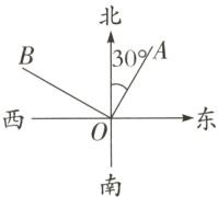 6. 如图,OA是北偏东30°方向的一条射线,若∠AOB = 90°,则OB的方向角是( )。