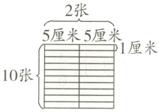 解析 如右图,横向能裁成2张长方形小纸条,纵向能裁成10张长方形小纸条,所以一共能裁成2×10 = 20(张)长方形小纸条,单面涂色的有20 - 5 = 15(张),占小纸条总数的$\frac{15}{20}$。