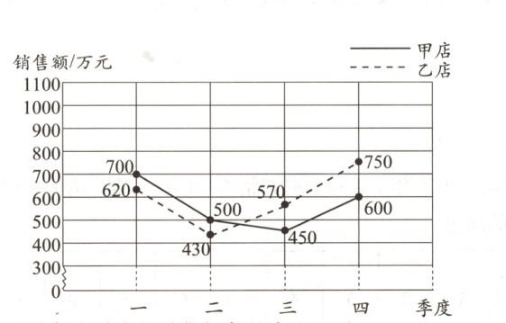 三、下面是家乐福超市甲、乙两个分店去年四个季度的销售额统计图,请你看图后回答问题。(10分)